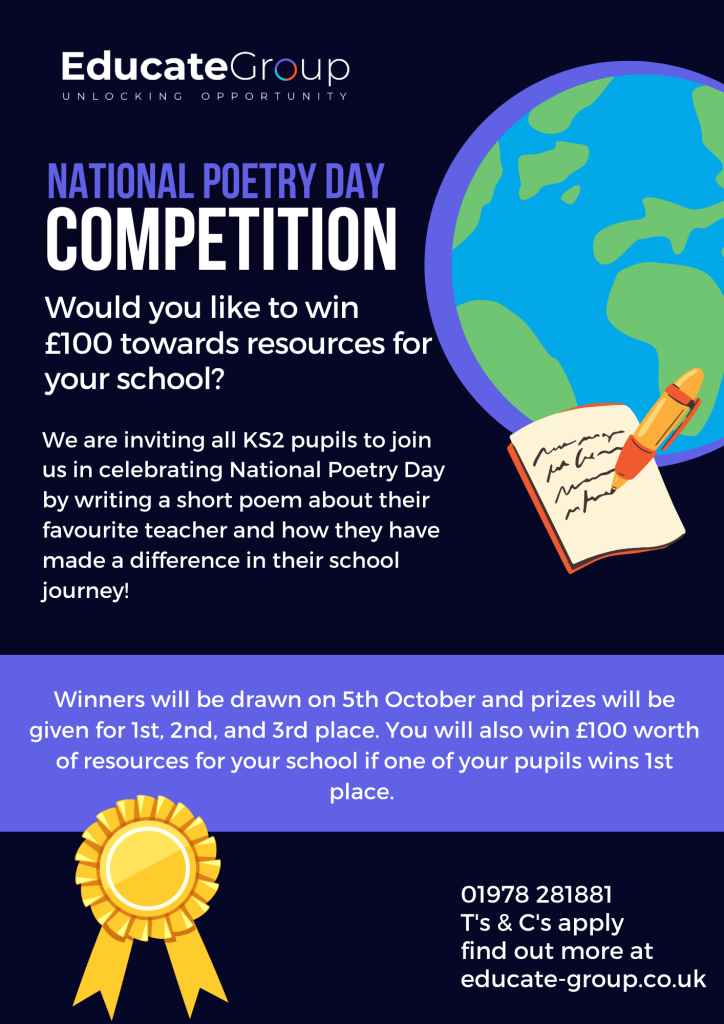 We’re excited to announce our National Poetry Day Competition, where you can win £100 towards valuable school resources.